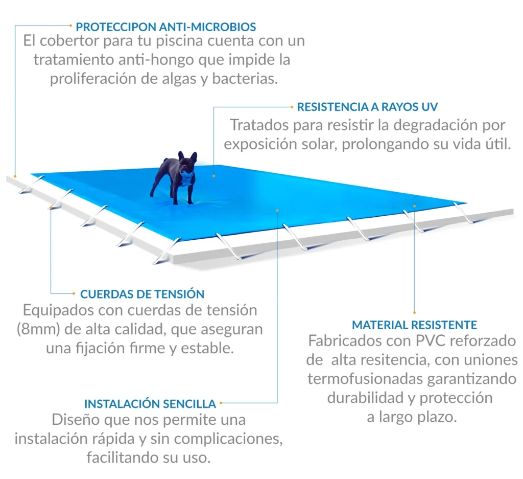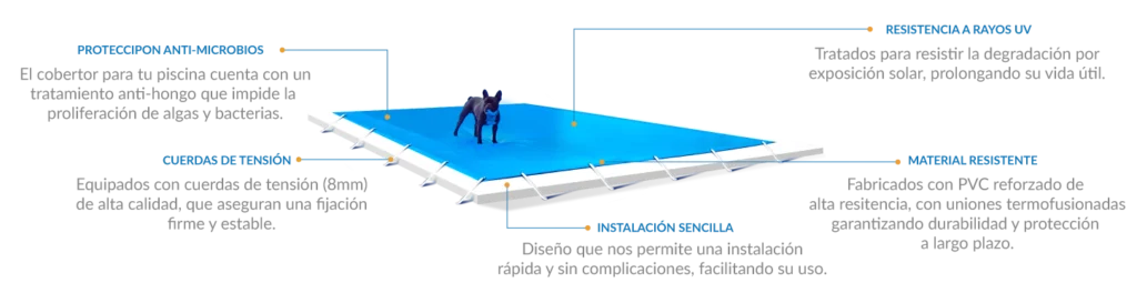 Nuestros cobertores para piscina están diseñados y fabricados con PVC de alta resistencia, lo que permite soportar un peso máximo de hasta 100 Kgs.