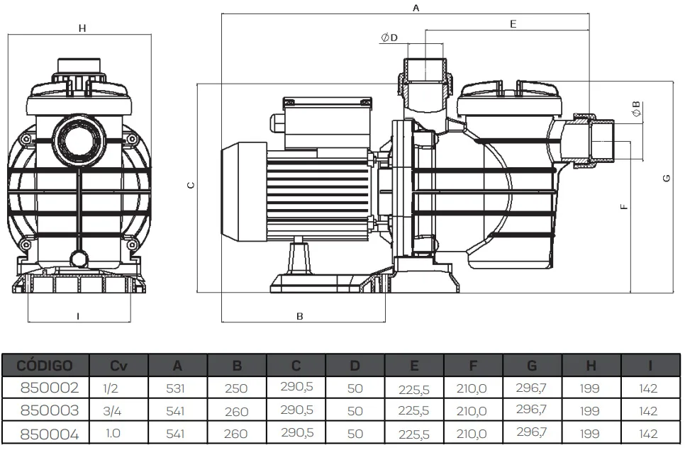 Las Motobombas Fluvia AstralPool son autocebantes, producidas con eje de acero inoxidable AISI-316 y sello mecánico, con juego de tornillos también en acero inoxidable y conexiones de 50 mm. Cuerpo de bomba y difusor producidos con plástico de ingeniería con rotor Noryl. El aislamiento de motor de clase F (soporta hasta 155ºC), con grado de protección IP55, permite trabajar en entornos con altas temperaturas y humedad.