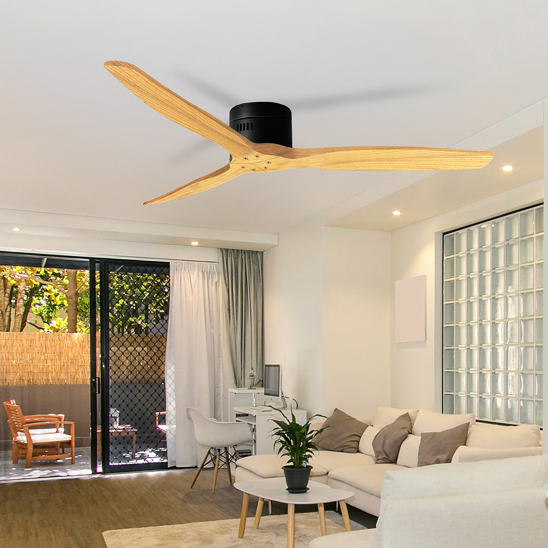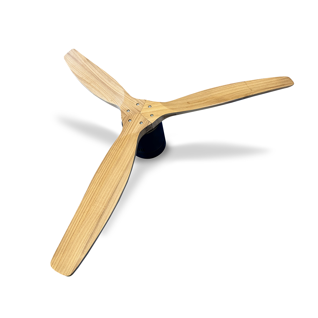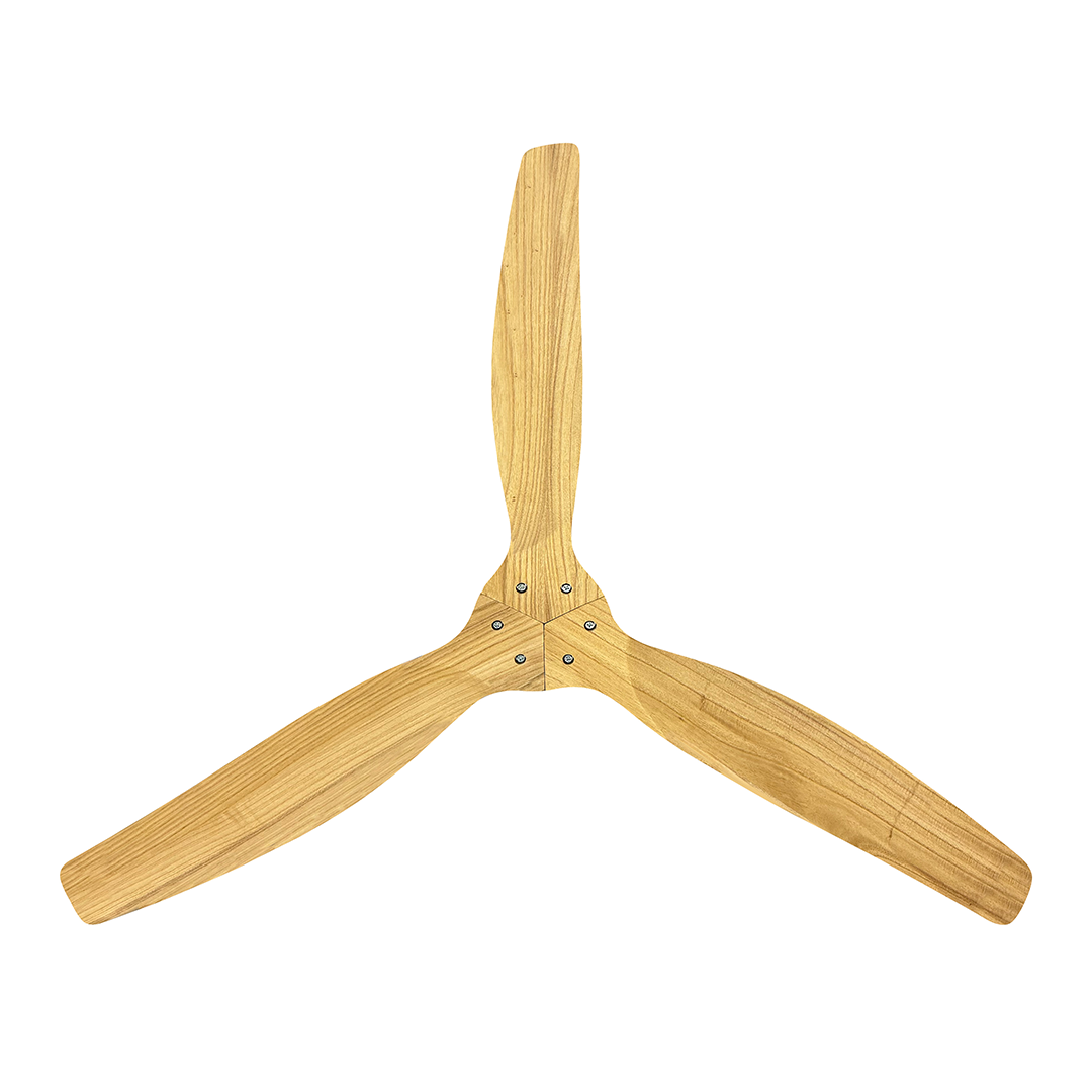 - Cantidad de aspas: Tres (3) de madera con acabado en madera natural.
